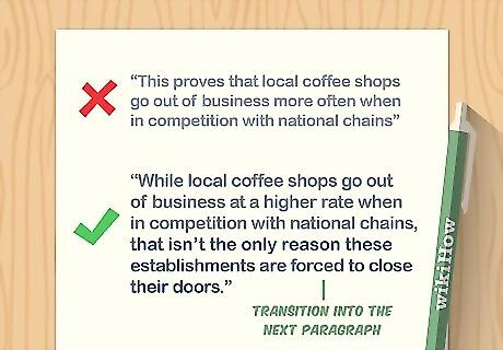 Remove repeated words, phrases, and ideas to make the paper more polished. Scan the paper for words and phrases that you repeat. Delete ideas that have already been explained elsewhere in the paper, and vary your sentence structure to avoid repeating subjects and verbs. If you need to, look up synonyms for frequently-used words. For instance, if you find yourself using the word “fear” repeatedly in your essay, consider replacing it with a synonym, like “terror,” “horror,” “trepidation,” or “dread.” If you’re repeating your main idea throughout your writing, try to find a way to connect it to the point of the paragraph or transition into the next paragraph. For example, instead of saying “This proves that local coffee shops go out of business more often when in competition with national chains,” you could say, “While local coffee shops go out of business at a higher rate when in competition with national chains, that isn’t the only reason these establishments are forced to close their doors.” Be sure to examine sentence level repetition, as well. Make sure the same words aren’t used more than once in a sentence. If they are, replace one of the words with a synonym.