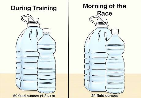 Keep your body hydrated. It is important to keep your body hydrated throughout your training weeks as well as the day of the race. Drink 60 fluid ounces (1.8 L) to 80 fluid ounces (2.4 L) of water each day during your training. Drink no more than 24 fluid ounces (0.71 L) of water on the morning of the race. Drinking too much water on the morning of the race can make you cramp up. Coconut water is a great way to replenish electrolytes without consuming the added dyes and sugars of a sports drink.