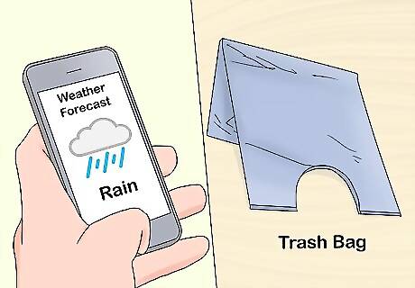 Look up the weather forecast and prepare accordingly. Wearing the appropriate clothing is essential when running in any type of weather. Make sure your layers are comfortable and able to be discarded along your route. You do not want to have to carry a sweatshirt for the entire race. If rain is in the forecast, bring a trash bag with a hole cut out for your head and wear it while waiting in the corral. Take it off before starting the race. If it is a cold rain, rub petroleum jelly on your arms and legs to keep warm. Do not rub jelly on your head or neck as it does not allow for adequate sweating and you may overheat. If the weather is supposed to be hot, try to drink cold fluids (such as a slushie) before the race. The New York Road Runner club collects discarded clothing and donates them to charity.