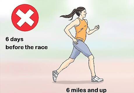 Avoid long distance running for the 6 days before the race. Keep all of your runs in the week prior to the big race around 5 miles (8.0 km) to 6 miles (9.7 km) long. Do not run the day before the marathon.