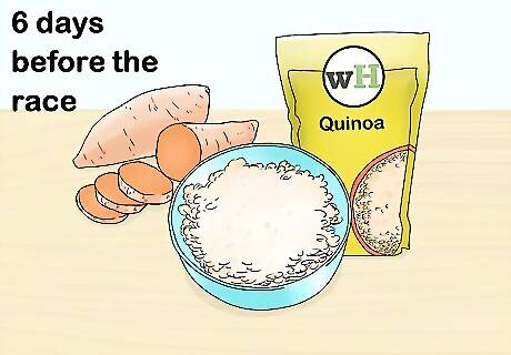 Eat more carbohydrates for the 6 days prior to the race. Try to consume at least 3 grams (0.11 oz) of carbohydrates per 1 pound (0.45 kg) of your body weight. Increase to 5 grams (0.18 oz) per 1 pound (0.45 kg) of your total body weight during the last 3 days before the race. Some good foods for carbohydrate loading are sweet potatoes, brown rice, and quinoa. Do not overload on carbohydrates. This will make you bloated and lethargic on race day.