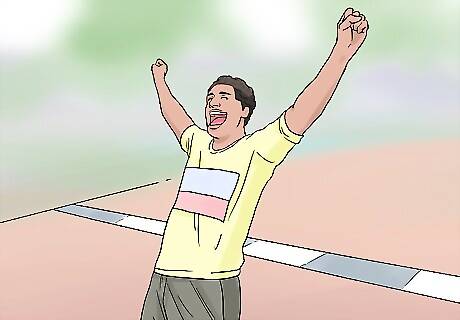 Cross the finish line and celebrate your accomplishment. Once you have crossed the finish line, it is important to stretch. Taking a long walk after the race will help flush the lactic acid out of your body and bring you gradually back to your resting state. Eat a big, hearty meal afterwards to replenish the nutrients your body lost while running.