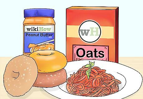 Eat foods that are rich in protein and carbohydrates. These types of food provide fuel for both your exercise and recovery. Try different types and quantities of food during your training routine to find out what works best for your body. Good energy foods include bagels with peanut butter, pasta, and oatmeal. Know how long it takes for your body to digest food before you are able to run comfortably. It can take up to 3 hours for your food to digest completely.