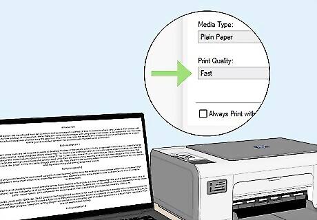 Switch to Draft Mode in your print settings. Before you print a document, look in the preferences or settings for an option labeled Draft Mode, Toner Save, EconoMode, or something similar. Draft Mode prints your documents in lower quality with less ink so you can easily check for errors or mistakes without wasting more ink.