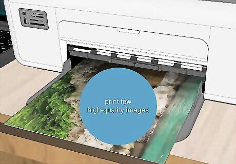 Print fewer high-resolution pictures. High-quality images take up the most ink when you’re printing something out, so cut them out of the document if you don’t need them. Switch to a printer-friendly version of a page, or use a lower-quality image so you can save your ink. Alternatively, use a printing service whenever you print out images so you don’t have to use ink from your printer.