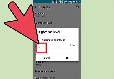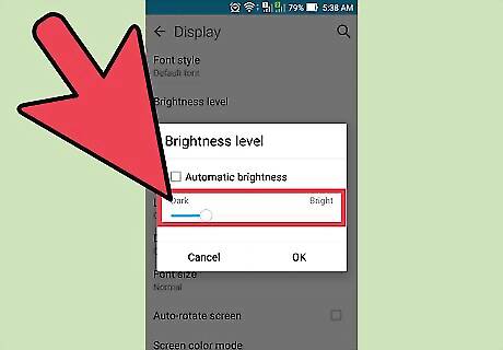 Change your display settings. By limiting your phone's brightness, you will use less power and drain its battery less quickly. To turn down your phone's brightness: On an iPhone, head to Settings -> Wallpaper & Brightness. Turn off Auto-Brightness and drag the brightness bar to its lowest option. On an Android, go to Settings -> Device -> Brightness. Adjust your brightness to be at its lowest setting.