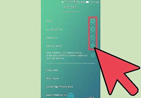 Turn off in-game effects. Unless you're using earphones, the Pokémon GO app will constantly be emitting sounds and vibrations that drain your phone's energy. Turn these off to save precious battery life. From the app's main screen, tap the PokéBall at the bottom of the screen. Tap the "Settings" icon at the top-right corner of the screen. Uncheck Music, Sound Effects, and Vibration. Check Battery Saver.