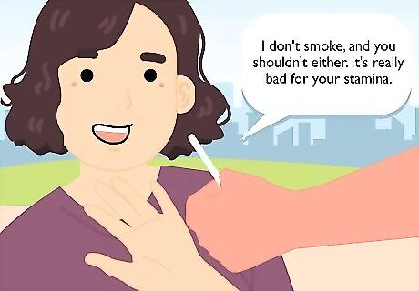 Say no and turn the pressure around. This might sound condescending and it's best to avoid pressuring your friends; however, it can bring the subject to an end if other courses of action didn't work out. For example, if your sporty friend offers you a cigarette, you can answer ”I don't smoke, and you shouldn't either. It's really bad for your stamina." If a friend mocks you for not having had sex yet, you can say “You can do anything you want with your life. Are you taking any birth control or STD precautions, though?”