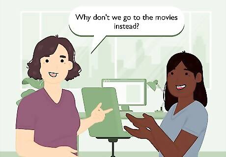 Say no and suggest an alternative idea. This works best when what you're being asked to do is an action that takes longer time, like smoking pot, getting drunk at home or having sex when you don't want to. In this case, you can simply suggest an alternative activity; your “no” will be implicit. Possible suggestions could be “Why don't we go to the movies instead?" “I'd rather go shopping," or “I think we'd better focus on our finals." Whatever you suggest, make sure to be specific. Avoid generic statements like “Let's do something different”; suggesting an alternative that your friend might actually like better will make it easier and faster to get past the situation.