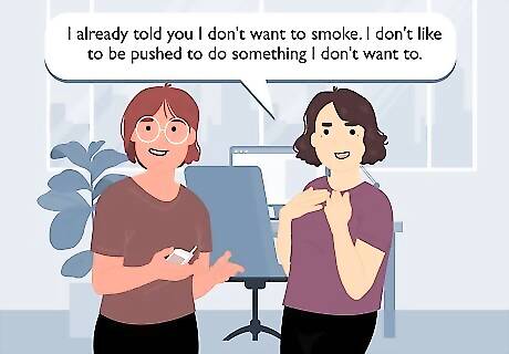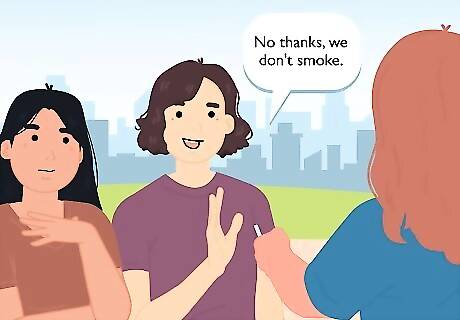 Say no and state why. Make your explanation short without making a big deal about it. If someone offers you a cigarette, you can simply say “No, thanks, I don't smoke”: that is a good enough explanation. This strategy works very well when you're asked to do something you don't want to, or when you want to avoid a specific situation. For example, if someone asks you to go to a party where drugs are involved, you can say “I'm not going, sorry, I know there'll be drugs and I don't want to find myself in that situation," or “I'm not going, sorry, I don't like the people who'll be there." You can also make up an excuse if providing the real explanation can make things awkward: “I'm not going, sorry, I already have plans for tonight." Do your best to make your statement as positive as possible. Try not to sound condescending or judgmental. You might not agree with someone's actions or habits but respecting their decisions will make them respect yours.