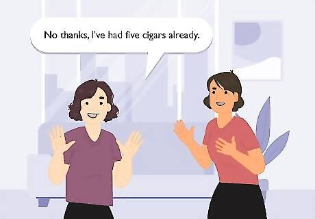 Say no and make a joke. Humor is often best way to get out of an awkward situation and helps release the tension. A good way to do this is by exaggerating the consequences of the action. If you're offered a drug, possible jokes can be “No thanks, you don't want to see me naked jumping around the room!” Another option is to give a sarcastic explanation. If you're offered a cigarette, you can say “No thanks, I've had five cigars already," or “No thanks, I'd rather smoke my pipe."