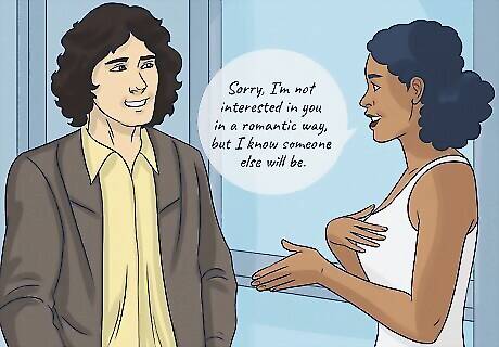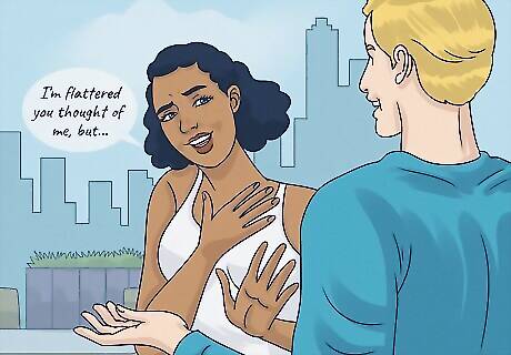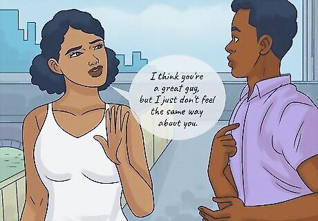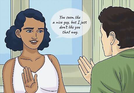 Be clear and direct when saying no. The worst thing you can do when you're politely rejecting someone is to give him false hope. It might be hard for him to hear “no” at first, but it will be much better for him in the long run. Remain straightforward and polite throughout the interaction, and you’ll be able to reject him without breaking his heart. Some examples include the following: “You seem like a nice guy, but I just don't like you that way. I appreciate that you thought to ask me.” "Thank you, but I'm not interested in going on a date with you, though I’m sure some lucky girl will be.” “I’m just not feeling a connection, so I’m going to have to pass.” Don't make excuses—you don’t owe them an explanation. Unless it's true, don't tell him that you're in a relationship. Avoid saying, “I just got out of a relationship, and I'm not ready to date.” Even if this is true, it might give him false hope that you'll change your mind, and that's not fair to him. Keep it short; you don't need to give a long-winded rejection just to seem nice.