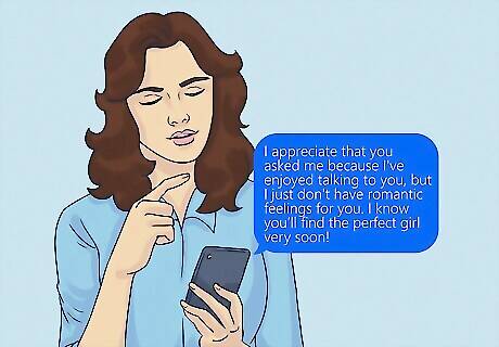 Remain honest. Often, it is easier to lie over text than it is to lie in person. It can be tempting to come up with excuses to let yourself off the hook, but it’s always preferable to be truthful. Stay honest by avoiding an open-ended answer. Make sure that he won't think you might be interested in the future, so give a guy an answer when he asks you out that is final, but end with something positive if possible. “I appreciate that you asked me because I've enjoyed talking to you, but I just don't have romantic feelings for you. I know you’ll find the perfect girl very soon!” Dating coach John Keegan includes responses like, “‘Hey, I really appreciate that you asked me that. I'm really flattered. But I'm not interested.’ It’s okay just to say ‘I just know we wouldn't be a match in that way. You seem like a wonderful person, but that's where I'm at on that. But thank you so much.’ That's the nicest way to do it.” Dating coach Mark Rosenfeld suggests rejecting a date over text with the following: “Hey, you know, I don't feel the connection between us, and I'm just going to be honest.” This way, “the guy can absorb your honesty rather than worrying about protecting his feelings.”