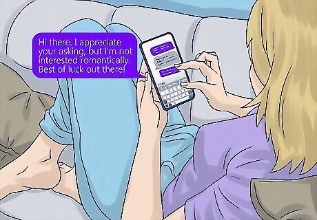 Be clear and concise when turning him down. If you’re wondering how to say no to someone asking you to hang out online, don’t overthink it. There are a lot of options on dating sites, so the guy who asked you isn’t looking to play games. Be genuine, say no respectfully, and be positive so he doesn’t waste his time. Politely decline and wish him well on his online dating journey! Examples of online rejection messages follow here: “Hi there. I appreciate your asking, but I’m not interested romantically. Best of luck out there!” “I’m flattered you’re interested, but I don’t sense a connection. Thanks!” “I know what I'm looking for, and I'm just not feeling it here, but I think you look like a great person who’s sure to find happiness!” Use a generic rejection if you’re not sure how to express why you’re not interested.