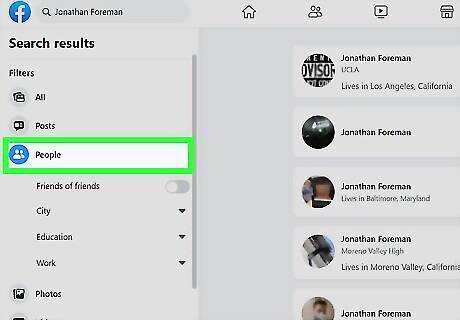 Click People. You'll see this in the panel to the left side of the page. The search results will only show you profile pages of people referring to the search you entered. If you entered a location, school, email, or other identifying terms in the search bar, you'll see the profiles of every person who is associated with your search.