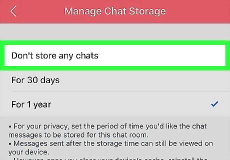 Tap to select Don't store any chats, For 30 days, or For 1 year. The setting you select will apply to all the Band members immediately, but will not recover any past messages. You will lose those messages if the time limit passes and you log out of the app, delete your account, change your device, or reinstall the app. For example, if you are engaged in a chat with messages over 1-year-old, you will still see those messages until you log out and log back in.