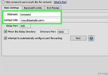 (Optional) Enter a nickname for your relay, and enter contact information in case the developers of Tor need to contact you about a problem. You can avoid spam by munging your email address, i.e.