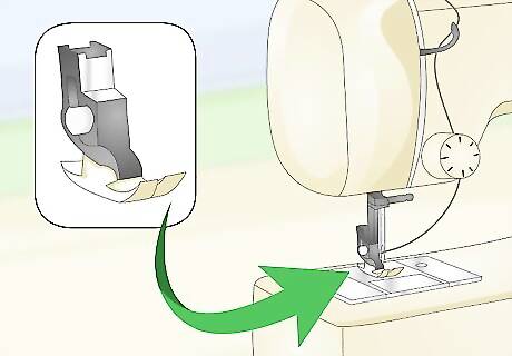 Use a teflon presser foot to prevent the oilcloth from sticking. Since a standard metal presser foot may stick to the oilcloth, remove it and pop a teflon presser foot in place. You can buy a plastic teflon presser foot at most fabric supply stores. If you can't find them, stick a little masking tape on the bottom of the presser foot so it slides over the oilcloth. If you're still struggling to get the presser foot to glide, turn the fabric over so you're stitching the back of the oilcloth. This will make it easier to feed the fabric through the machine.