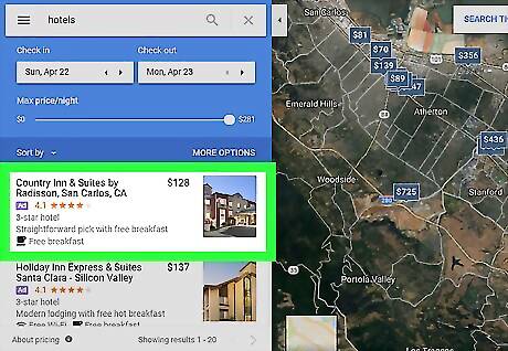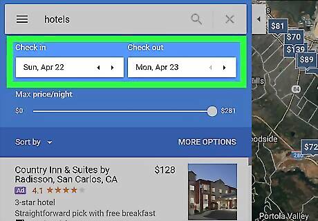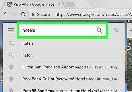 Search for a location. Type an address, city, or landmark into the search bar at the top-left corner of the screen, then select a match from the search results. This opens a map of that area. If you’re looking for a hotel at your current location and the map is already at the right place, skip to the next step.