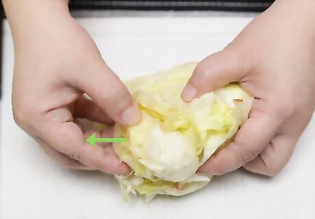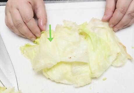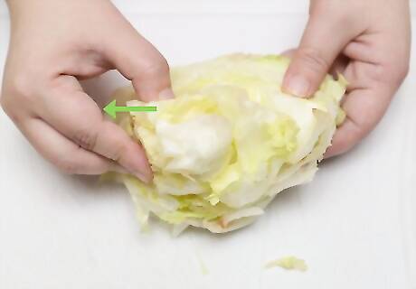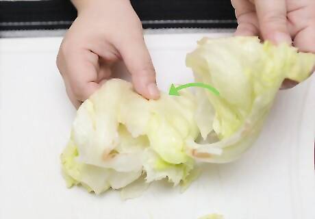 Remove the tip of the lettuce head. The stalk of the lettuce tends to be tough and can have a bitter taste. Remove the pale, hard tip of the head and discard it. Also discard any of the outer leaves that appear wilted or discolored.