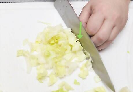 Turn the strips into small pieces. Turn the cutting board 90 degrees and cut through the lettuce in close rows from the new direction. This will result in a pile of small pieces of lettuce, like the leaves in a chopped salad.