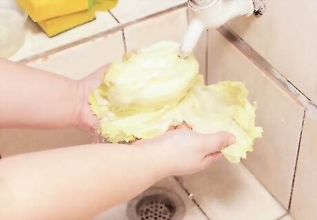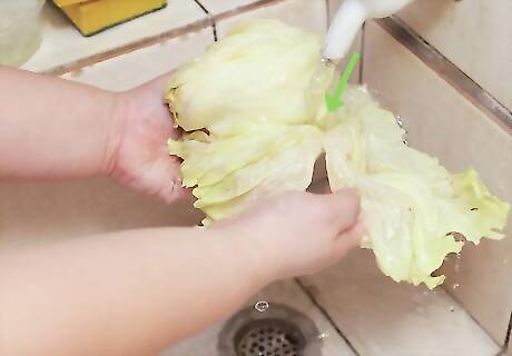 Wash the lettuce. To be sure you aren't ingesting any dirt or pesticides, always wash produce before you prepare it. If the lettuce is marked “ready-to-eat,” the FDA has certified that it is clean and can be eaten as it is, but some experts recommend washing it again when you get home. Remove the outer layers of leaves, until you get to a layer where you can't see any visible dirt or wilted edges. Grasp the entire head of lettuce and run it under running water. Gently scrub the exterior of the lettuce with your fingers to remove any traces of dirt or pesticides. Do not soak your lettuce in a sink filled with water – this will not remove the dirt.