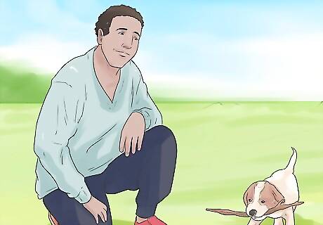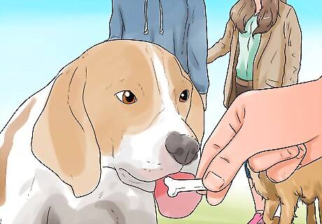 Invite people over often. To keep your dog socialized, you will need to continue to introduce him to new people and animals. Making sure that your dog has regular exposure to many different types of people and animals will help to maintain the work you have done to socialize him. You can also use ongoing socialization as a way to help your dog conquer his fears about certain people or objects. For example, if your dog has a fear of men with beards, invite a couple of bearded men over to dinner. After your dog has gotten used to how they look, have them feed your dog a few treats. This will help your dog to feel more comfortable with bearded men.