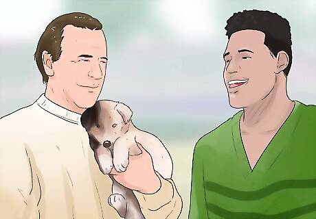 Seek help from an animal behaviorist or veterinarian. If you have an older puppy or a dog which was poorly socialized as a puppy you will have to work with the dog to get it to be an acceptable canine citizen. Dogs that were raised as “puppy mill” breeding dogs, those which had poor puppy socialization, or who were raised from birth away from other dogs often become poorly socialized adult dogs. Before you try to socialize an adult dog, you should seek the advice of an animal behaviorist or a veterinarian with training in dog socialization. Your local humane society may have an animal behaviorist on staff or a college of veterinary medicine will have trained behaviorists. If your dog shows any tendency to bite or be aggressive with another dog, do not attempt to socialize him on your own. Contact a professional. It is better to admit that you need help with your dog than to have him injure, maim, or kill another animal or even a human. Do not attempt to socialize your dog unless you are capable of maintaining absolute physical control of your dog at all times. If you are unable or unwilling to do so, do not attempt to socialize your dog.