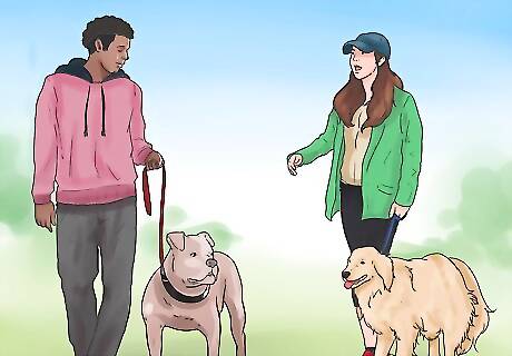 Ask a friend to help you introduce your dog to their dog. You will need to have both dogs on leashes and kept about 10 feet (3 m) away from each other, so it is necessary to have two people on hand to make the introduction. Only attempt to introduce your dog to a dog that is friendly to other dogs and that is under the control of an owner that you know well.
