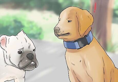 Introduce your dog to your friend’s dog. Walk up to your friend, with your dog next to you (on his leash). Do not allow your dogs to get too close. Stand so that you and your friend are between them. If your dog growls, turn around and walk away. Make your dog sit with his back to the other dog until he calms down. When he does calm down, reward him with a quiet “good boy.” Depending on the dog, this process may need to be repeated for a few days to a few weeks. Keep both dogs on leashes and separated from each other during this process. Make sure that your friend keeps his dog on its leash and stands about 10 feet (3 m) away from you in the beginning and after any aggressive reactions. Increase the distance if necessary.