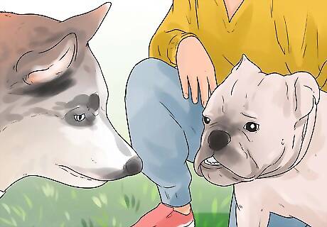 Distract your dog with treats to defuse any tension. If your dog becomes aggressive, stop the introduction by moving the dogs away from each other. Talk to your dog in a soothing voice and try to calm him down. Show him a treat and then give him a simple command and reward him with the treat once he's earned it. Do not allow the dogs to get closer to each other if either one seems aggressive. Don't just give your dog a treat right away for no reason; this may encourage their aggressive behavior. Consider commanding your dog to sit, or complete another similarly simple task. If the first attempt resulted in aggressive behavior from one or both dogs, increase the distance between the dogs and try to introduce the dogs again. If your dog does not have a positive reaction by the time you have attempted to introduce him to another dog for 15 minutes, stop and try again another day. You may have to do this several times before your dog has a positive reaction to the other dog.