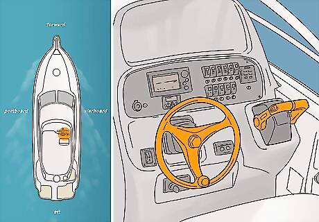 Learn the yacht steering controls. Most will have a steering wheel and two throttles. These controls are required for sufficient steering of the boat. The steering wheel will not do a good job of steering at slow speeds in a tight harbor. The engines do most of the steering at slow speeds. The engines alone can steer your boat. For example, to make a right turn around in a tight area, advance the left throttle slowly while retarding the right throttle the same amount. This is called differential steering. If you do this properly you will make the turn without ever moving the boat forward or backward. Of course you will have to practice this for a long time to perfect it. In a car, you can idle the engine and hold the brake to stop. In a boat, you are always at the mercy of the wind and tide. The only way to hold your position is with differential steering with the engines at all times. Don't say left or right in a boat. The terms for the four directions are port, starboard, forward and aft.