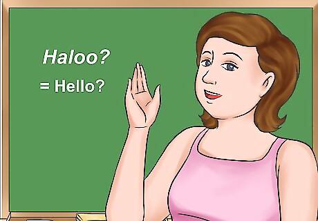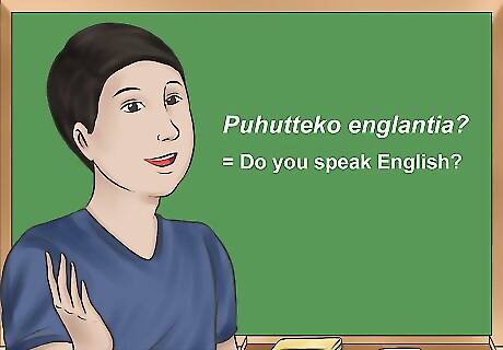 Learn basic pronunciation. In order to understand the basics of Finnish language, you need to understand pronunciation. Certain letters are pronounced differently in Finnish and some letters with accent marks are specific to the Finnish language itself. Some letters in the Finnish language are simply softer or stronger than in English. The letters K, P, and T are pronounced stronger than they are in English. The letter R is pronounced much stronger than in English, as you must roll your tongue to say it. Some letters are pronounced only slightly differently than they would be in American or British English. The letter A sounds somewhat like the "u" in cup. The letter E is like the e sound in hen. The letter "I" is pronounced shorter, like it would be pronounced in "fit" or "bit." The letter O is also pronounced shorter and slightly different than in English, sounding more like the A in "all." In Finnish, "U" is pronounced as it would be in the word "fall" in English. A few letters have a completely different pronunciation in Finnish. J is pronounced like a hard Y in English. Y in Finnish can be difficult to pronounce for English speakers. To pronounce "Y," pronounce the 'u' in 'full'. You can listen to pronunciations of the Finnish Y online to see how close you are to approximating the sound. Sometimes, A's and O's have two dots above them to indicate a different pronunciation. Ä is pronounced like the "A" in "hat." Ö would be pronounced like the "u" in "fur." If a word has two of the same letter next to each other, they make the same pronouncing ion but extended, such as 'hiss' having two 's' letters rather than 'his' which has one.
