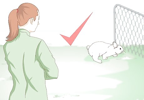 Consider allowing your rabbit space outside. Rabbits are outdoor animals by nature, so it may be a good idea to let your rabbit roam outside on occasion. However, if you're going to allow your rabbit access to the outdoors, take certain precautions. You can set up a pen in a flat area in your yard. Make sure the area is free of any potentially toxic plants. Also, make sure any gaps in the fence are small enough that your rabbit can't escape. A few times a week, let your rabbit play in the pen. You'll want to supervise him the entire time to make sure he doesn't get loose. Some rabbits may try to dig under a pen. If you see your rabbit digging, stop him. You can also buy a small harness for your rabbit at a local pet store. You can take your rabbit on short walks around your backyard. However, be careful if there are any dogs or cats that occasionally roam your neighborhood. They may see your rabbit as prey.