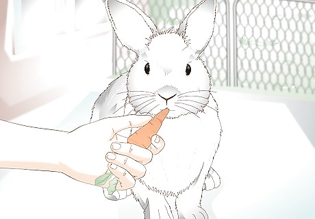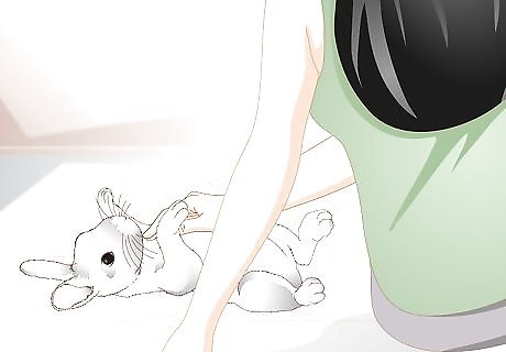 Pet and snuggle your rabbit. Rabbits can develop very affectionate bonds with their owners. However, you need to let your rabbit come to you on his own terms. Try to get down on the floor, on your rabbit's level, and let him out of his cage. Make sure the room is closed off, quiet, and free of distractions. Wait for your rabbit to approach you and only then should you try petting and snuggling him. Rabbits enjoy different things, so it may take you awhile to see what kind of petting your rabbit enjoys. If your rabbit enjoys a form of petting, he may close his eyes in contentment and rest on the floor. Some rabbits are more social than others. Certain rabbits may get in your lap while you're sitting down, while others may keep a slight distant. If you want to spoil your rabbit, make sure you allow him to set the rules. Allow your rabbit to come to you on his own terms, and pet and snuggle him in ways he enjoys. Watch out for negative body language. This is a sign your rabbit is agitated. Rabbits may growl or grind their teeth when stressed. They may also kick their feet in the air while walking away from you. If your rabbit engages in these activities in response to petting or cuddling, stop. Your rabbit is telling you he does not like being handled in that way.