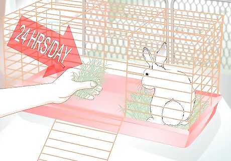 Provide hay. Rabbits need access to hay 24 hours a day. Hay is great for nesting, and also aids in digestion. Go to the pet store and pick out a bag of high quality timothy or oat hay. Make sure there's always a few piles of hay present in your rabbit's cage so he can eat and nest as he pleases.