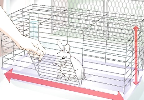 Provide your rabbit with a large cage. If you want to spoil your rabbit, give him a lot of space. A large cage will keep make your rabbit happy, allow you to spoil him. Swing by your local pet store and pick up a spacious cage for your pet. As a general rule, the bigger the cage the better. Try to get the biggest cage you can safely fit in your home. You can try getting a cage separated into different compartments, allowing your rabbit to move from one space to the next. Some people allow their rabbits to roam about their home, or have one room designated as a rabbit safe space. This can be great for your rabbit, especially if you don't have the money or space for a larger cage. However, if you make this choice, rabbit proof that area first. Make sure no electric cords are exposed without proper covering. Provide a litter box, so your rabbit has somewhere to eliminate. You should also supervise your rabbit when he's loose to make sure he doesn't dig at the carpet or chew on the furniture.