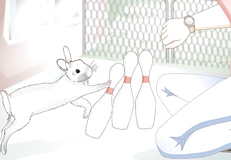 Schedule play time every day. Rabbits are social creatures and love to play games with their owners. If you want to spoil your rabbit, schedule some time to play each day. Rabbits love to knock things over, throw things, and chew. Play games that cater to these instincts, always setting aside a small pocket of your day to play with your rabbit. You can set up miniature bowling pins for your rabbit. You can usually buy these in a department store, in the toy section. Rabbits love to knock things down, so your rabbit will love pushing over the bowling pins after you set them up. You can provide a variety of cloth and plastic toys for your rabbit, which you should be able to find at a pet store. Many rabbits enjoy picking things up and throwing them. You can allow your rabbit to throw his toy, and then retrieve it for him. Provide toys for your rabbits to chew on as well, as rabbits love to chew. Give them old rolls from paper towel and toilet paper, as well as boxes of shredded paper.