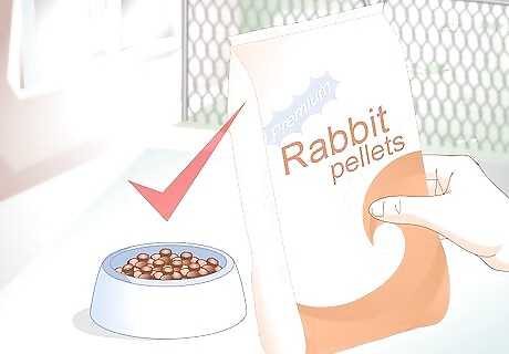 Choose high quality pellets. Your rabbit's diet should consist of high quality pellets. For younger rabbits especially, pellets are a vital component of a healthy diet. Pellets should have at least 18% fiber. They should also be nutritionally balanced. You can talk to your vet about the right type of pellet for your rabbit's needs. Younger rabbits who are still growing will generally need more pellets. If your rabbit is older, you'll want to give him less pellets and feed him vegetables and hay as a supplement to his diet.