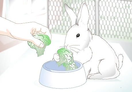 Give your rabbit lots of vegetables. Rabbits love vegetables, and they're also a great component of a healthy diet. In addition to spoiling your rabbit with quality hay and pellets, it's a good idea to give him fresh vegetables each day. Alfalfa, beets, broccoli, pea pods, lettuce, green peppers, kale, and carrots are some great options to spoil your rabbit. Make sure to cut bigger veggies up so your rabbit can easily eat them. Also, file down any harsh edges so your rabbit doesn't hurt his teeth or gums while chewing. You should also pay attention to the types of vegetables your rabbit likes if you want to spoil him. If he's largely disinterested in lettuce, but goes crazy for kale, give him kale more often. Your rabbit will feel happy and spoiled if he gets to load up on his favorite foods all the time.