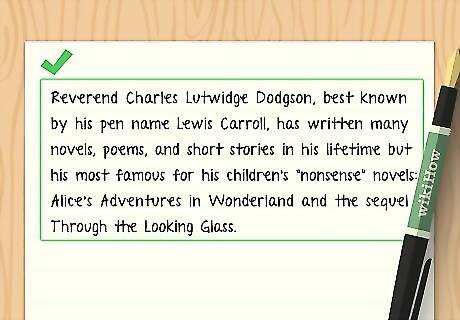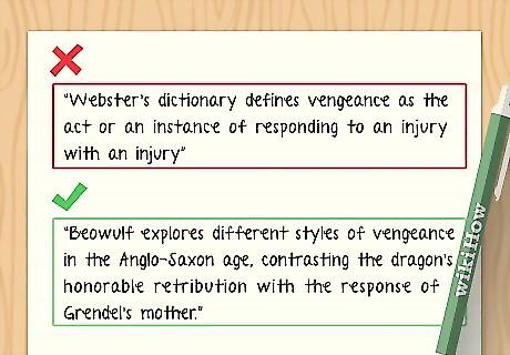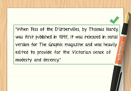 Make sure you cite work correctly. If you use another person's words or ideas, you'll need to give them credit. Check with your professor to find what kind of style you should use. MLA, Chicago, and APA are commonly used citation styles. They each use a different method of citation. Be sure to give the author credit. You don't want to be accused of plagiarism.