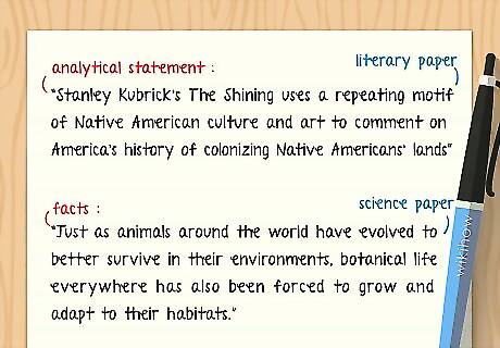 Start with a factual statement about your subject. Some people like to start broad and work their way into a research topic. This reaches those people who want to know the broad appeal of your work. If you're writing a paper on the importance of comics, you could assert the importance of comic books since the 1930s. If you want to discuss the role of farmers in the American Revolution, you can make a blanket statement about the complex causes of the revolutionary movement. This is how most people begin their research papers. They don't want to make their subject seem too obscure, so they write about larger points before jumping head first into their topic. Just make sure that your broad statement is related to your thesis statement. And make sure that everyone can agree with your broad statement. You don't want to have your readership criticizing your argument from the beginning. You need to build a certain degree of trust. By all means, avoid the "Throughout history" or "In modern society" types of opening lines. These are so overused that they have become hackneyed, and they will damage your credibility as a writer before your reader has looked at another word.