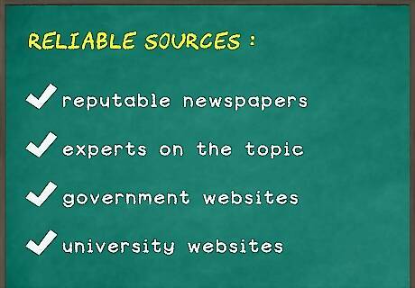 Identify primary sources/data sources. Depending on your project, you'll need to find ways of collecting information to back up your claims. If your paper is on a science topic, you'll need to set up an experiment and collect data from that experiment. If you are writing a history paper, you'll need to find primary sources (information produced during the time under investigation) that support your thesis statement. Primary sources can be found in a variety of locations. Some are reprinted in primary source collections. Others can only be accessed in archives or libraries. For our paper on the role of farmers and the American Revolution, we might need to visit local archives and the U.S. National Archives and Records Administration to get the necessary documents. If you're feeling overwhelmed by the volume of research, see if your library has appointments with a research librarian. Librarians stay up to date with current trends in scholarship and can help guide your search.