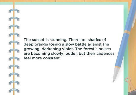 Describe scenes that you see. Use all five of your senses, and watch an elaborate sunset, stare at the mountains, sit in a field of waving grass—or do something simple like describing a cafe as you sit down and drink your hot chocolate or munch on a muffin. Drawing from real-life observation is a powerful tool that many professional writers use to enhance their own descriptions and imagery. If you take your journal with you everywhere you go, you’ll be able to jot down impressions, observations, or phrases that you see or overhear throughout the day.