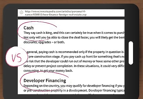 Decide how you want to finance. Depending on your target country, a mortgage may not be available to a foreign buyer, and many US banks don’t lend for purchases of foreign property. Therefore, you should decide how you want to finance your purchase as soon as you determine the overall budget. There are a few options, including: Seller financing. The availability of financing from the owner or developer is most likely going to be limited to newly built properties and properties without an outstanding mortgage. Nonetheless, this can be an attractive option if the seller is willing. An IRA. There is very little restriction on the type of investment you can hold in an IRA. Therefore, if you manage your own IRA, then you can use the funds in the account to purchase property abroad. Also, there are a number of niche lenders for overseas real estate of varying degrees of reputability. Speak with an attorney before contracting with any such lender.