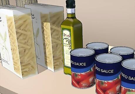 Stock up on pasta. Pasta is easy to store. Use pasta with a variety of herbs and seasonings to create flavorful meals fast.