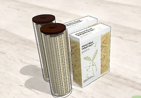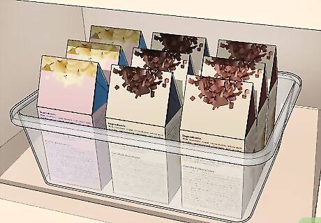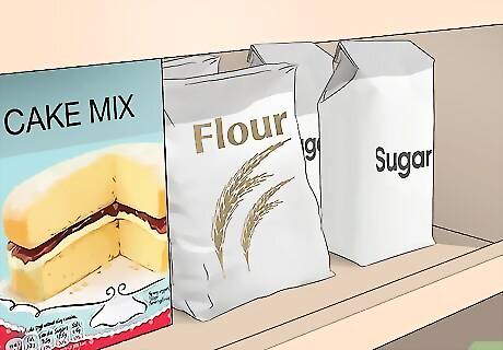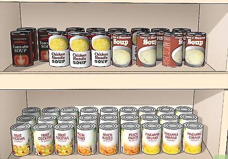 Arrange dry goods by type. Flour, sugar, baking powder, and muffin and cake mixes are baking items. Mashed potatoes, gravy, and packaged pasta sides are savory. Separating these items by type can help speed up the process when you’re preparing meals.
