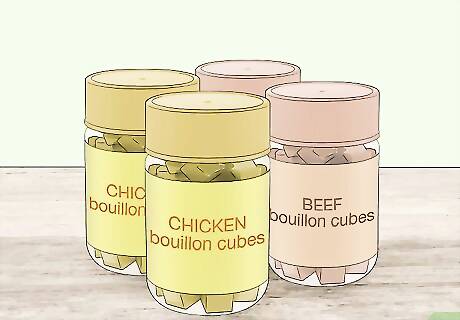 Buy a variety of bouillon cubes. Chicken and beef bouillon cubes last for 6 to 12 months and allow you to prepare chicken or beef stocks for healthy, flavorful meals.