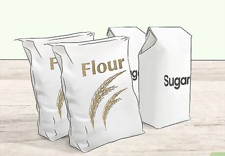 Stock flour, baking soda, and sugar. These are basic ingredients you can use in desserts and in savory dishes. Purchase large sizes of these ingredients to save money.