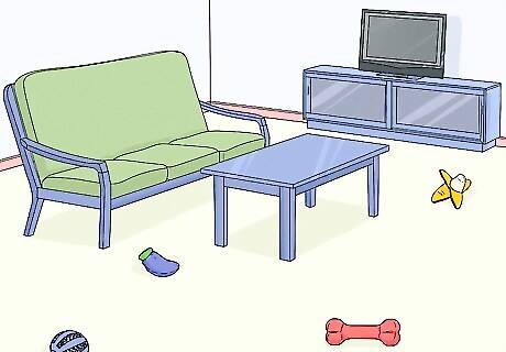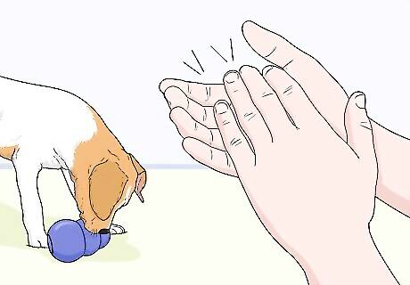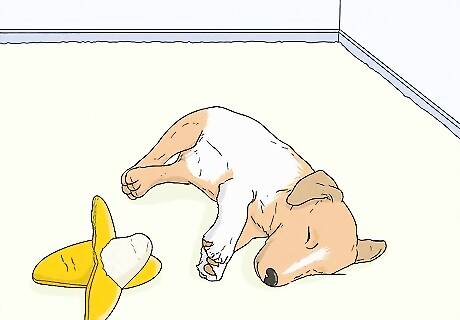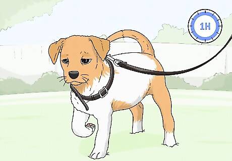 Exercise your puppy for 1 hour every day so they are tired out. Take your dog out on at least 1 walk per day, play fetch with them in a yard or a field, and let them run around to expend energy. Puppies have the most energy out of all dogs, and when they get bored, they’ll be more likely to chew on things they aren’t supposed to.Tip: Puppies usually get their energy in short bursts, so try doing a few quick play sessions or walks throughout the day instead of one long walk.